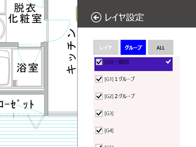 レイヤの切り替えは上部の「レイヤ」をタップします。すべてのグループを表示にするには「ALL」をタップします。二度目の「ALL」タップですべてのグループを非表示にします。なお、書き込みグループは非表示になりません。